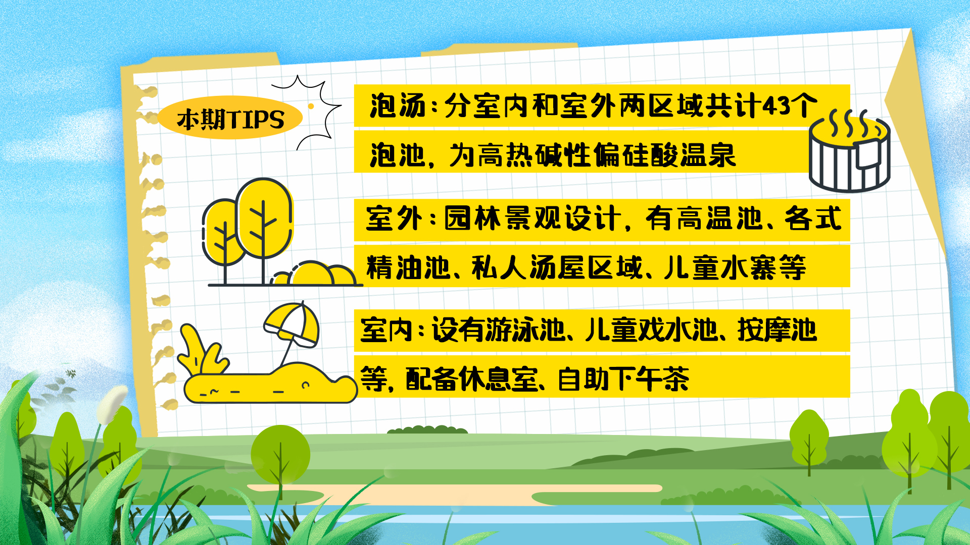 泡汤:分室内和室外两区域共计43个泡池,为高热碱性偏硅酸温泉